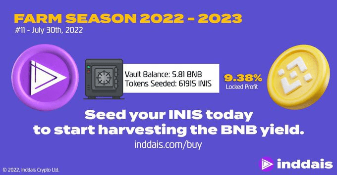 Your BNB yield depends on the amount of tokens you have seeded and its duration. We add BNB to the vault constantly based on mining results from our farm. Since the results are paid as BNB, you do not need to sell your INIS tokens to book your profit. That is, once purchased, you can seed the same token in all seasons and claim your BNB forever.